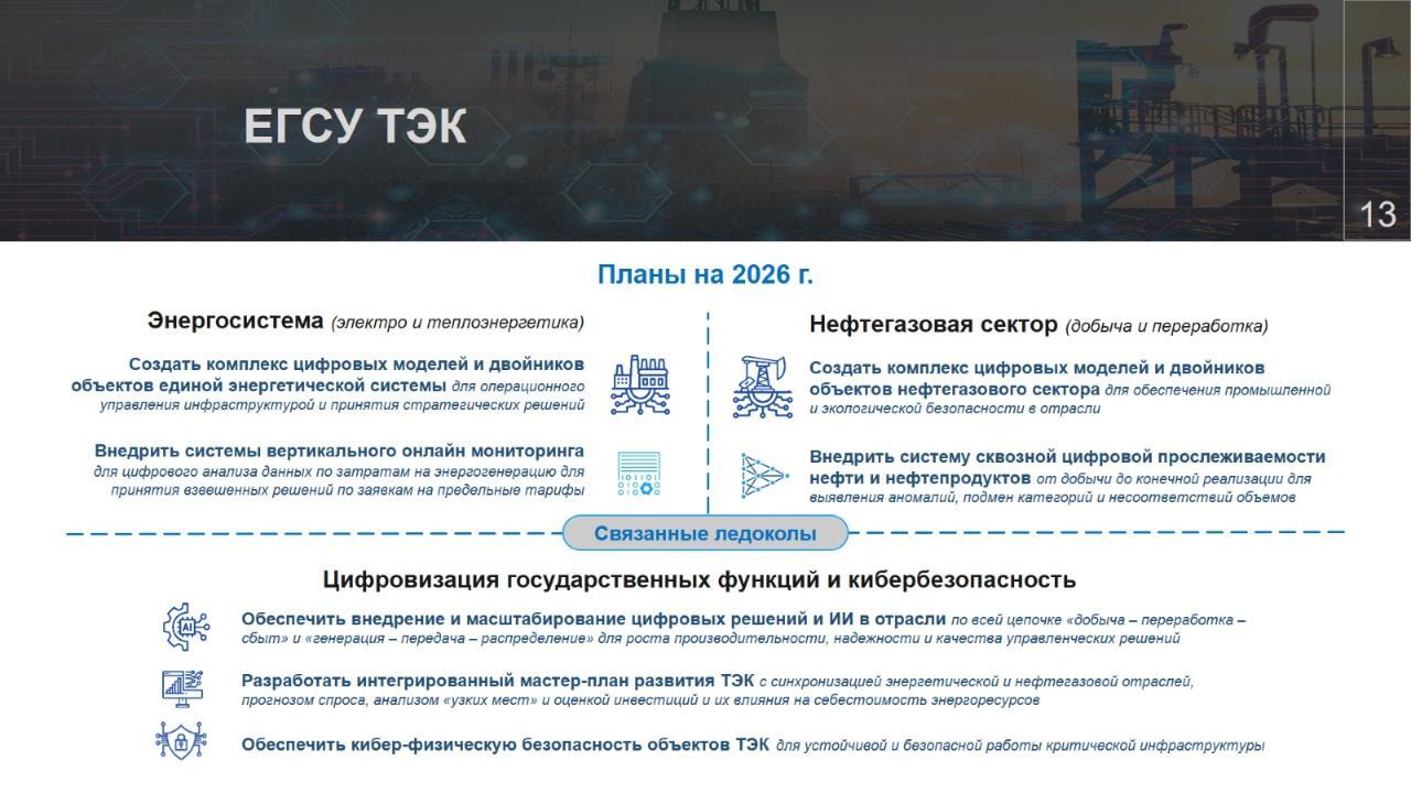 Этот процесс включает создание цифровых двойников объектов электро- и нефтегазовой инфраструктуры, внедрение вертикального онлайн-мониторинга операционных процессов и обеспечение сквозной прослеживаемости нефти и нефтепродуктов.